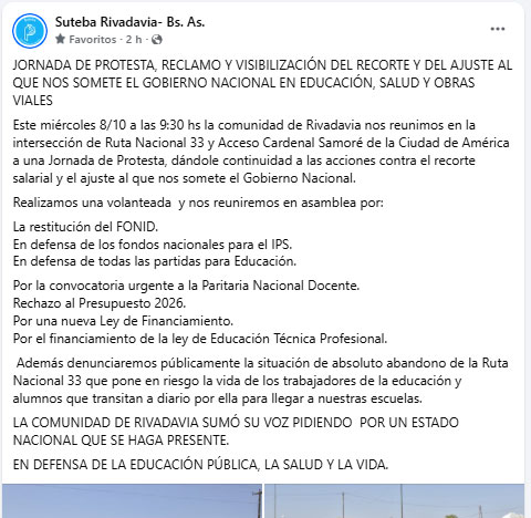 - 08-10-2025 Reclamo docente en América por el estado de la ruta 33, la paritaria nacional, y el FONID