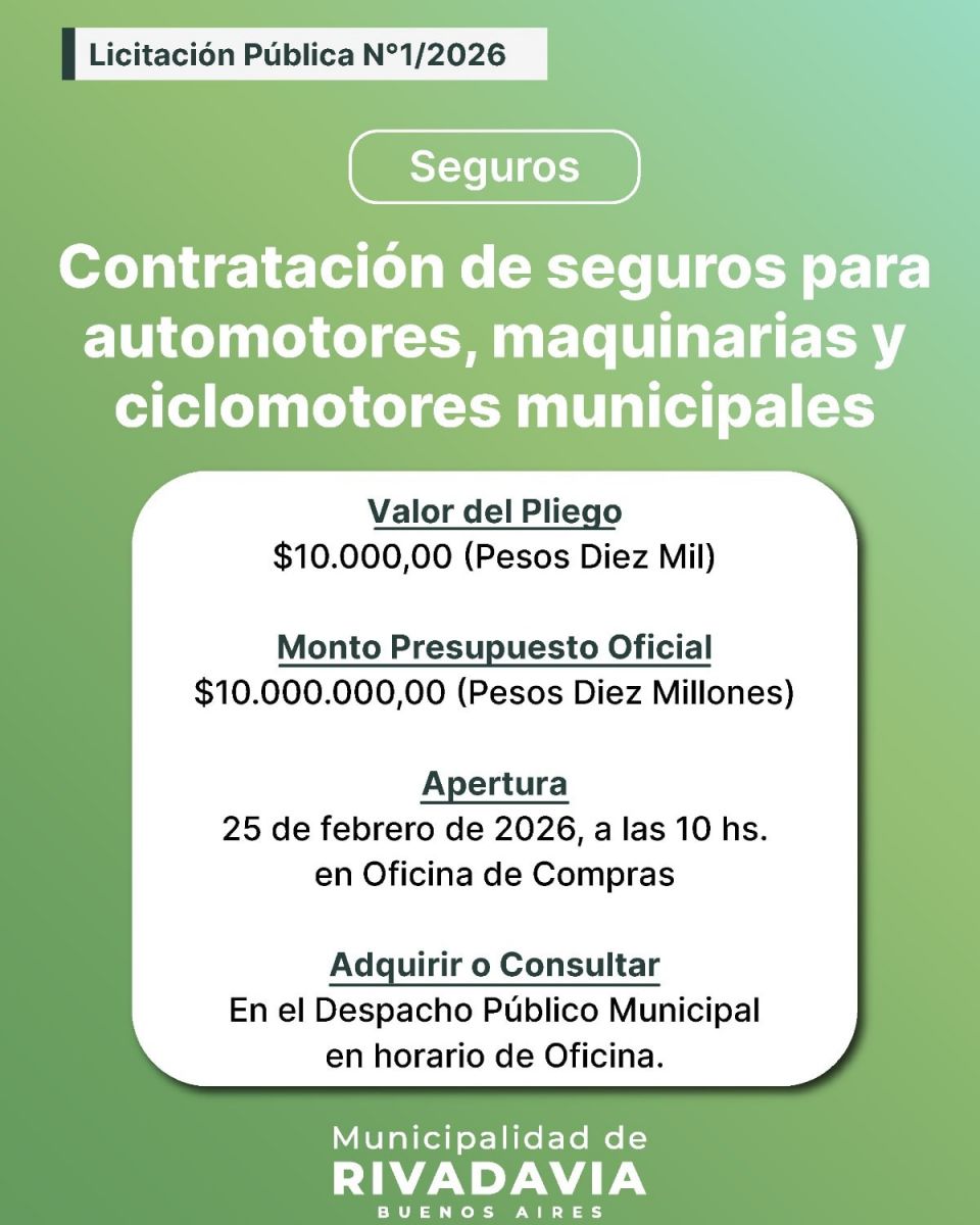 La Municipalidad de Rivadavia llama a Licitación Pública Nº 1/2026 para la contratación de seguros para automotores, maquinarias y ciclomotores municipales.