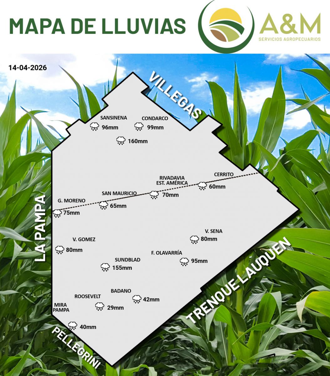 Según la firma A&M Servicios Agropecuarios en la ciudad cabecera cayeron 70 mm. En otros puntos del distrito como Sansinena o Condarco la medición estuvo cerca de los 100 mm. González Moreno marcó 75 mm y Fortín Olavarría, unos 95 mm.